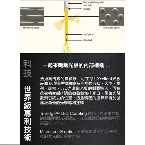 專利導光技術:?每一盞安靜矗立的燈板裡具備數百萬個微小三稜鏡,肉眼依稀可見的微粒,串成了光行進的軌跡。